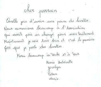 Certain(e)s filleul(le)s rencontrent des problèmes de santé dû à l'absence de port de lunettes ; le quotidien d'Elisabeth, Marie-Antoinette, Dolorah (parmi d'autres), a été grandement changé grâce au soutien de l'association, et donc grâce à vous chers lecteurs et adhérents !